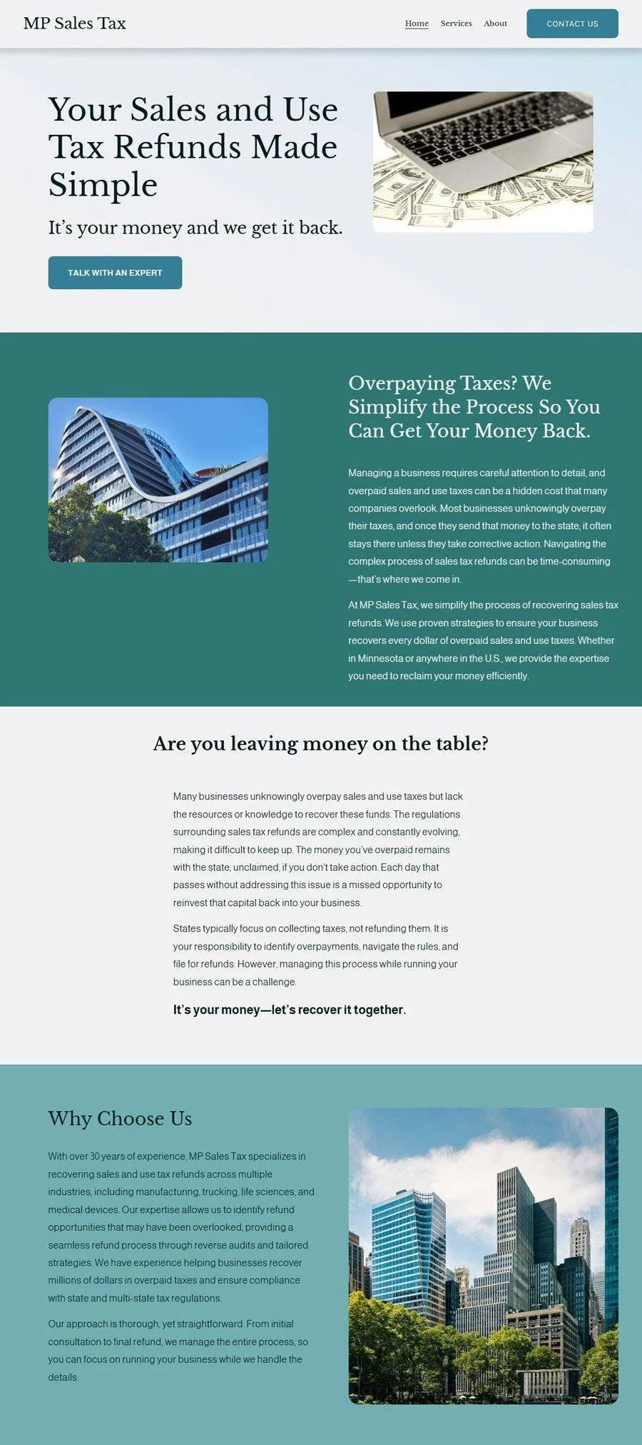 A custom website with compelling copywriting designed for MP Sales Tax, a consultancy specializing in recovering overpaid sales and use taxes.